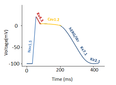 许多化合物因为阻断了人源hERG离子通道被迫退市。原因在于抑制hERG通道后可能导致的尖端扭转型室性心动过速(TdP)风险。但仅仅检测hERG钾通道的抑制具有局限性,因为动作电位的产生除了hERG钾通道负责动作电位的复极化,同时还有Nav1.5Ca1.2的参与去极化和平台期,膜片钳检测平台有能力完成一系列的心脏安全靶点(Kv4.3Nav1.5Nav-latehERGCav1.2HCN)平台的检测。