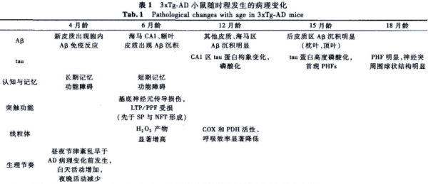 Belfiore et al. 2019 Aging Cell 18:e12873 [PMID:30488653] 报道了 C57BL/6;129 遗传背景的 3xTg‐AD 雌鼠β-淀粉样、磷酸化 tau、海马体和皮层斑块、神经炎症和认知退化的发生、严重程度和发病率。大部分评估的3xTg-AD小鼠app/ps1/tau三转基因小鼠表型在 6 月龄时就已明显。但是,值得注意的是,3xTg-AD小鼠app/ps1/tau三转基因小鼠皮层斑块在 12 月龄时被首次检测到。